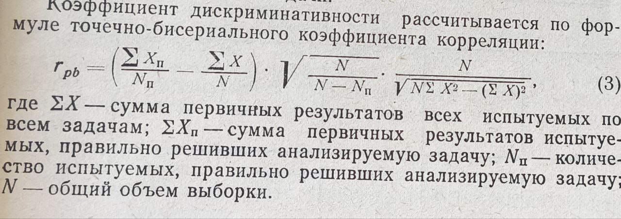 2.5) Коэффициент дискриминативности по-другому называется коэффициентом согласованности. То есть высчитывается насколько точно с помощью вопроса теста можно распределить группу испытуемых к примеру, на интровертов и экстравертов. Здесь используется достаточно сложный математический подсчет, описанный А.А. Крыловым. См. рисунок 1. Однако следует понимать, что большая часть методик редко использует данный коэффициент расчета.